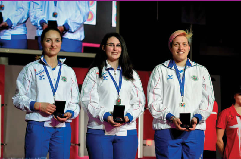 Doppia medaglia per le donne del compound con le senior Marcella Tonioli, Irene Franchini e Laura Longo sconfitte solo in finale dalla Danimarca 236-232 e vincitrici così di un brillantissimo argento, e le junior Erica Benzini, Camilla Alberti ed Elisa Roner che si mettono al collo il bronzo battendo proprio le danesi 228-223.