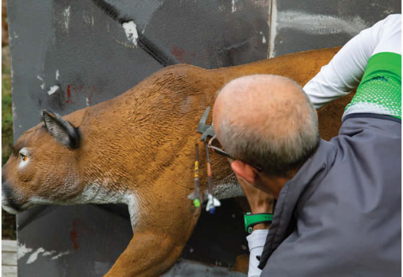 Le divisioni – Possono partecipare alle gare 3D quattro divisioni: arco compound, che tirerà dal picchetto rosso; arco nudo, arco istintivo e longbow che tireranno dal picchetto blu. Per tutte le divisioni è vietato qualsiasi dispositivo elettrico o elettronico attaccato all’attrezzatura degli atleti; qualsiasi genere di dispositivo elettronico di comunicazione (inclusi telefoni cellulari), auricolari o sistemi per la riduzione del rumore oltre la linea di attesa del campo per i tiri di prova e in qualsiasi momento sul percorso di gara; telemetri o altri aiuti per stimare le distanze o le pendenze, che non siano previsti dalle presenti regole riguardanti il materiale degli arcieri; qualsiasi promemoria scritto o sistemi elettronici che possano essere usati per calcolare le pendenze e distanze, ad esclusione degli appunti riguardanti i normali contrassegni per il mirino, la registrazione degli effettivi punteggi personali o qualsiasi parte dei Regolamenti World Archery. Una recente nota Interpretativa WA chiarisce inoltre come gli atleti durante le competizioni 3D non possano portare foto o disegni che riproducono sagome recanti l’indicazione del gruppo poiché potrebbero costituire un aiuto nella stima delle distanze.