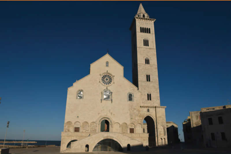 La grande chiesa cominciò a sorgere nel 1099, per volontà del vescovo Bisanzio, a seguito della morte e canonizzazione del giovane pellegrino Nicola, sbarcato a Trani, dalla Grecia. Fra le particolarità della cattedrale c’è la cripta, non nascosta ma luminosa ed alta, con crociere sorrette da fitte ed eleganti colonne di marmo greco. Il campanile fu realizzato dal XIII secolo.