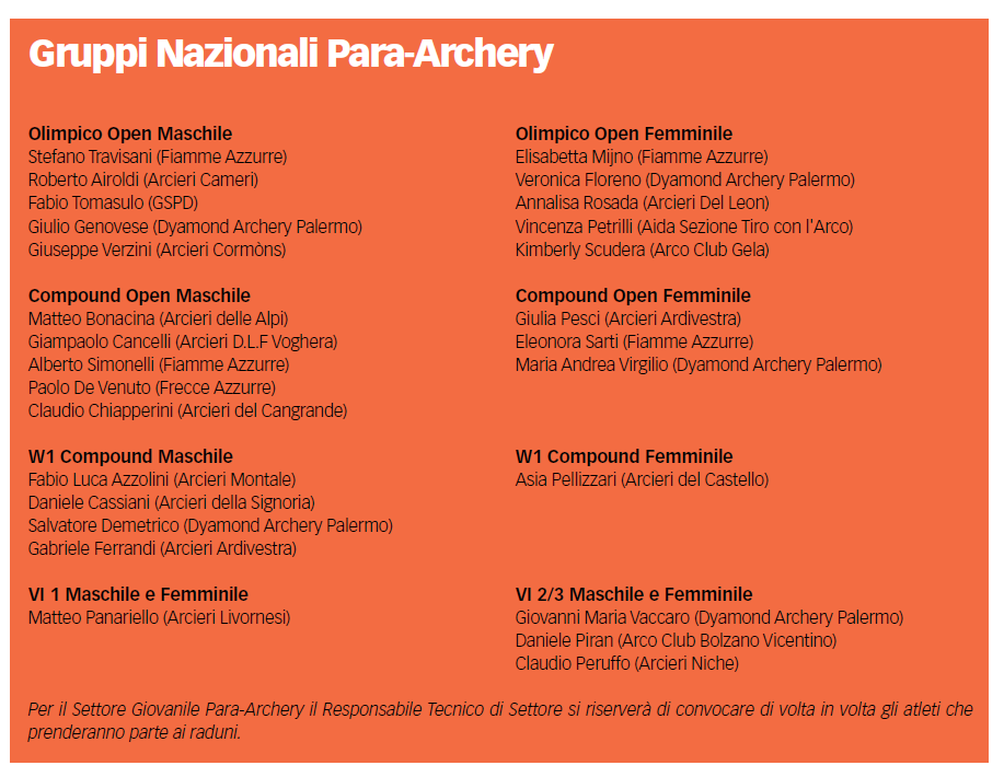 Per il Settore Giovanile Para-Archery il Responsabile Tecnico di Settore si riserverà di convocare di volta in volta gli atleti che prenderanno parte ai raduni.