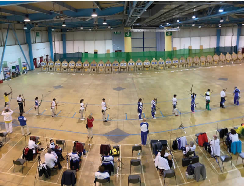 Il campo di gara sarà allestito prevedendo un interasse minimo di 1,30 m. La circolare n.55 specifica che dovranno essere definiti gli spazi di attesa (box) della misura di minimo 1 m x 1,10 m, riservati agli atleti e ai tecnici e qualora ce ne sia la possibilità anche uno spazio per gli archi.