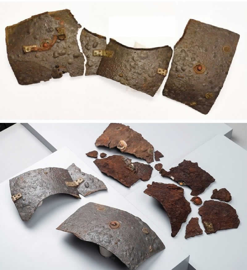 Con circa 30 pezzi, questo esemplare di lorica segmentata mostra accorgimenti tecnici molto più sofisticati di quanto si sapesse. Si trattava infatti di un oggetto prezioso, frutto di una intensa lavorazione. Come è possibile, quindi, che fosse stata lasciata indosso al cadavere senza essere trafugata dai vincitori?