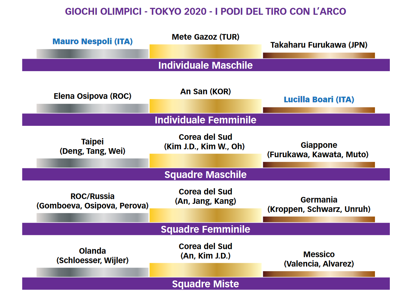 Allo Yumenoshima Park Archery Field grazie al bronzo di Lucilla Boari e all’argento di Mauro Nespoli l’Italia ha festeggiato per la prima volta due medaglie nella stessa edizione dei Giochi Olimpici