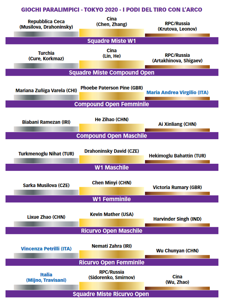 Ad aprire le danze ai Giochi Paralimpici è stata Maria Andrea Virgilio, bronzo nel compound open, battendo la sua bestia nera nella finale per il terzo gradino del podio, ovvero la russa Stepanida Artakhinova, che l’aveva sempre battuta nei duelli precedenti. Un esordio alla Paralimpiade davvero da incorniciare per la siciliana della Dyamond Archery, così come quello di Enza Petrilli (argento), sconfitta solamente allo shoot off dalla regina del ricurvo Zahra Nemati (al terzo sigillo individuale consecutivo). “Brilla più di un oro” ha dichiarato la calabrese di Taurianova dopo aver mordicchiato la pesante medaglia al suo collo.