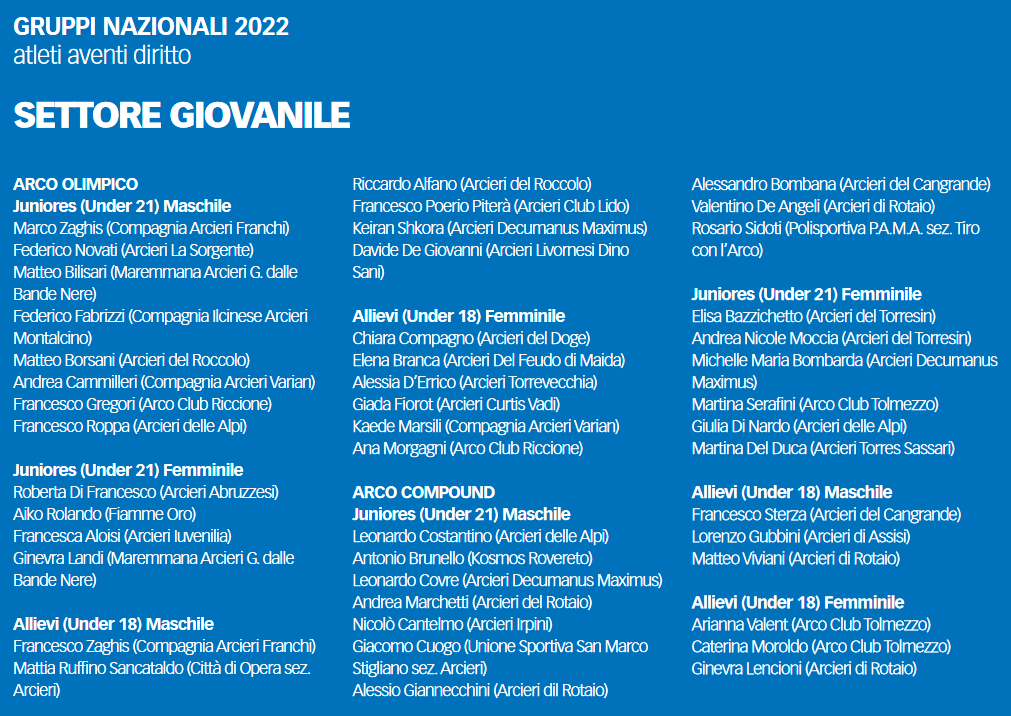 Questi appuntamenti serviranno quindi per monitorare gli azzurrini che, non va mai dimenticato, a causa della pandemia e delle restrizioni che tutti conoscono, sono coloro che hanno avuto maggiori difficoltà da gestire per poter effettuare raduni e competizioni internazionali. Gli incontri tecnici però, non serviranno solo agli atleti che già fanno parte dei Gruppi Nazionali. La Commissione Giovanile ha infatti predisposto un progetto da attuarsi sul territorio, con il supporto di Comitati Regionali, Società e tecnici personali dei giovani arcieri: l’idea è quella di realizzare degli stage che permettano agli atleti più promettenti di seguire un percorso di crescita che li possa portare a confrontarsi con gli azzurrini, con l’obiettivo di incrementare le loro qualità tecniche ed aumentare anche il serbatoio di giovani cui la Nazionale potrà attingere in futuro.