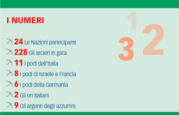 Nel complesso per la spedizione italiana, che contava 16 atleti per il ricurvo e 12 per il compound, tra Under 18 e Under 21, ha concluso la manifestazione collezionando 2 ori e 9 argenti, mentre al primo posto del medagliere c’è Israele con 4 ori, 2 argenti e 2 bronzi, seconda la Francia con 4 ori, 1 argento e 3 bronzi. Alle spalle dell’Italia c’è la Germania, che si è guadagnata 2 ori, 2 argenti e 2 bronzi.