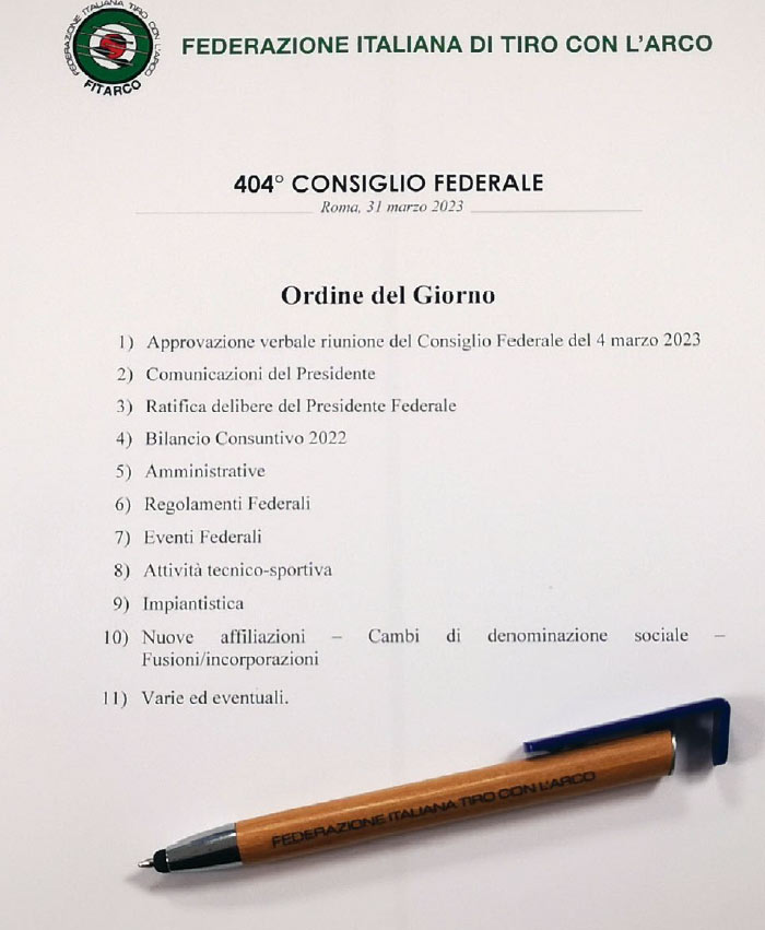 Dopo aver approvato il verbale della riunione del Consiglio Federale del 4 marzo 2023, il Presidente Scarzella ha letto le sue comunicazioni e in seguito sono state ratificate le delibere del Presidente. Tra queste, gli incarichi ai professionisti che faranno le lezioni rivolte alla formazione per il progetto “A Scuola con l’Arco”, oltre all’acquisto dei kit arcieristici da spedire alle scuole che partecipano al progetto “Scuola Attiva Junior” e altro materiale necessario per gli Eventi Federali.