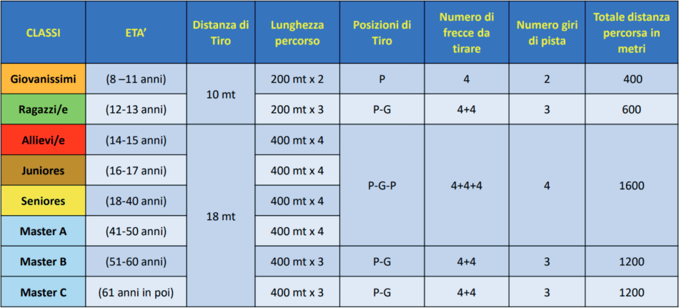 Il programma nazionale della Fitarco suddividerà invece gli atleti in un numero maggiore di classi di appartenenza; per le classi Giovanissimi e Ragazzi addirittura una distanza di tiro di 10 metri: (vedi tabella)