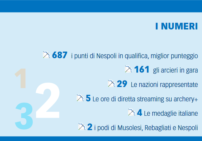 Soddisfazioni arrivano anche nelle sfide individuali con Federico Musolesi che si dimostra in grande forma prendendosi l’argento e quindi perdendo solo lo scontro finale contro il campione olimpico e padrone di casa Mete Gazoz (6-0). In precedenza solo vittorie: in semifinale contro l’uzbeko Sadikov allo shoot off 6-5 (9*-9) dopo aver battuto 6-2 il turco Kirmizitas, 6-2 il moldavo Dan Olaru, allo shoot off 6-5 (10-8) il francese Bernardi e 6-0 l’altro transalpino Valladont.
