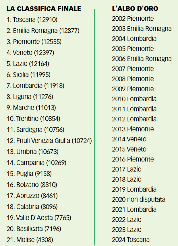 È quindi la Toscana a chiudere il regno del Lazio che durava da due anni e che aveva portato all’alternanza tra il Comitato Regionale del centro Italia e la Lombardia, bravi a spartirsi il primo posto dal 2017 al 2023, con quattro vittorie dei laziali e due dei lombardi. Nell’albo d’oro a primeggiare resta sempre il Piemonte con le sue sette vittorie dal 2002 a oggi, seguito proprio dalla Lombardia a 6 e dal Lazio a quota 4. L’Emilia Romagna, che è andata davvero vicino al successo in questa edizione, resta a 2 successi, come il Veneto.