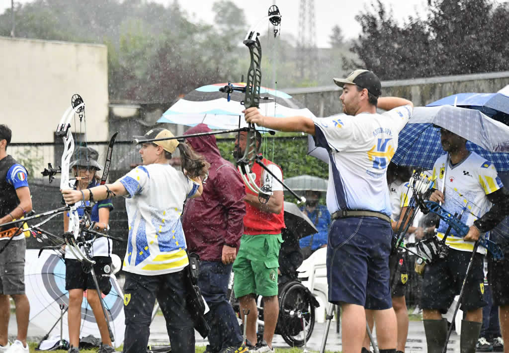 I TITOLI A SQUADRE – La cerimonia di premiazione, spostata al chiuso nel Palazzetto dello sport attiguo al campo di gara, dove comunque cadeva acqua dal soffitto talmente erano intense le perturbazioni, incorona quindi i nuovi campioni a squadre e mixed team. Questi gli esiti delle sfide. Nell’arco olimpico maschile gli Arcieri Iuvenilia di Morello, Paoli e Tonelli non lasciano scampo agli Arcieri Montalcino (Fabrizzi, Pasqualucci, Santi) con un netto 6-0 nella sfida per l’oro, mentre la lotta è durissima per l’assegnazione del titolo al femminile. Gli Arcieri delle Alpi che contavano nel terzetto la medagliata paralimpica Elisabetta Mijno catapultata in Toscana direttamente da Parigi, insieme a Marotta e Ceriana, la spuntano allo shoot off 5-4 (28-24) nel derby piemontese con gli Arcieri Iuvenilia (Degani, Andreoli, Rolando).