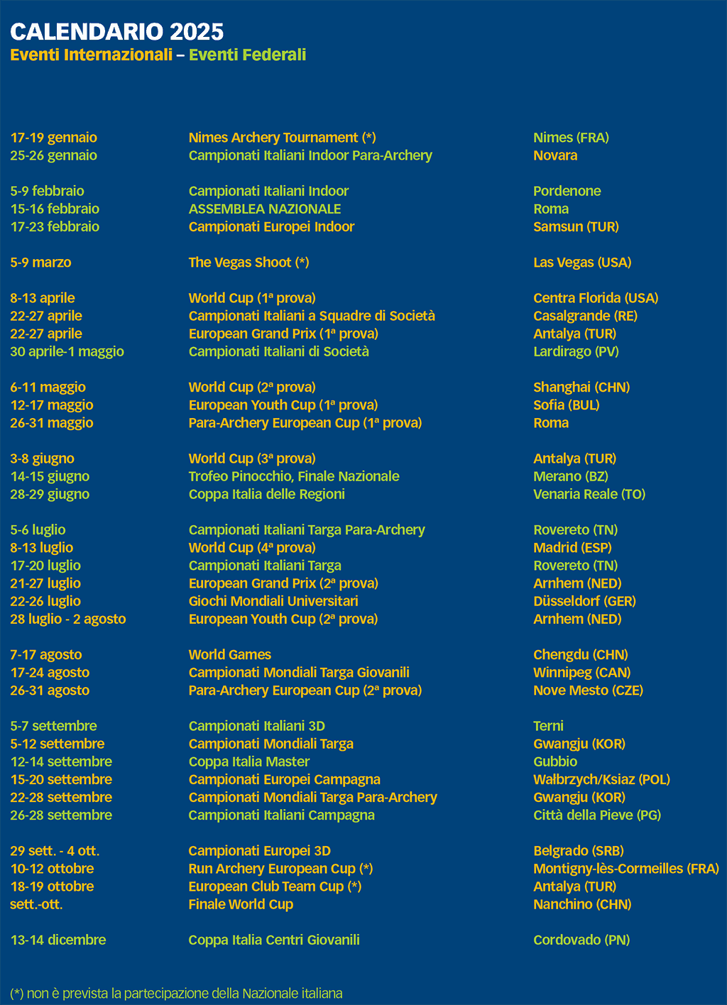 Il 2024 è già un ricordo, l’anno delle Olimpiadi e Paralimpiadi di Parigi e di tante altre soddisfazioni a livello nazionale e internazionale per l’arco italiano va in archivio e lascia spazio al 2025 con un calendario già disegnato e sempre più ricco di eventi.