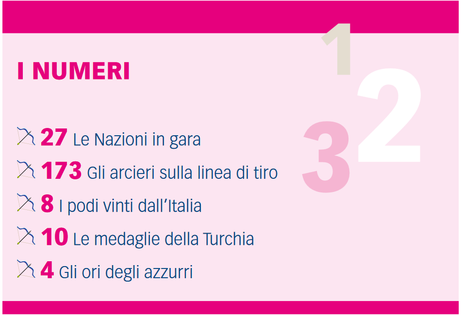 Gli azzurri erano presenti in Turchia con un gruppo quasi del tutto differente rispetto ai convocati della World Cup: torna in campo internazionale Michele Frangilli e, insieme a un veterano del suo calibro che sta ricoprendo anche il ruolo di assistente tecnico degli azzurri, c’erano pure diversi giovani col compito di maturare esperienza, come l’esordiente Lucia Mosna, o atleti di ritorno in azzurro, ma col compound, come Marco Seri, che ha condiviso la linea di tiro con l’esordiente Manuel Sartorello, oltre che alcuni ritorni, come l’azzurra paralimpica Eleonora Sarti. Pur con diversi cambiamenti rispetto all’uscita di coppa del mondo, il risultato è stato lo stesso assai soddisfacente per il contingente italiano, capace di raggiungere il podio con le squadre e nell’individuale, lanciando l’Italia fino al secondo posto del medagliere con 8 allori (4 ori, 2 argenti e 2 bronzi), solamente due in meno dei padroni di casa della Turchia, primi con 4 ori e 6 argenti. Solo le briciole per tutte le altre, in una competizione che contava 27 Nazioni e 173 arcieri sulla linea di tiro tra ricurvo e compound.