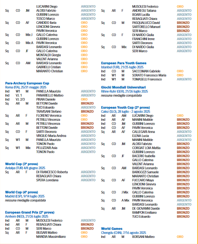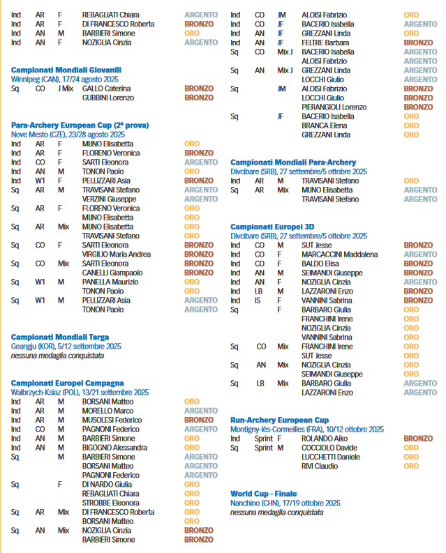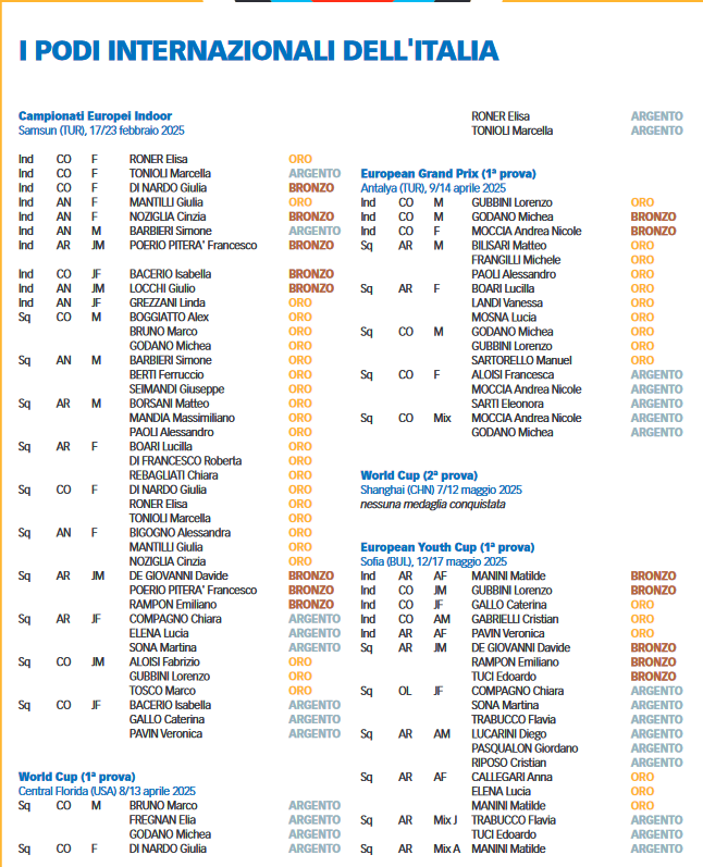 In prospettiva olimpica, va sottolineato che nelle competizioni di tiro alla targa al chiuso e all’aperto l’Italia ha ottenuto con i senior 27 podi, 18 di questi sono arrivati grazie alla divisione compound che farà il suo esordio con la gara mixed team nel programma di Los Angeles 2028, mentre 9 sono stati conquistati dagli azzurri del ricurvo. Se contiamo esclusivamente le gare outdoor dei senior, che comprendono le tappe di Coppa del Mondo, i Grand Prix e la rassegna iridata in Corea del Sud il bottino complessivo è di 5 ori, 9 argenti e 4 bronzi.